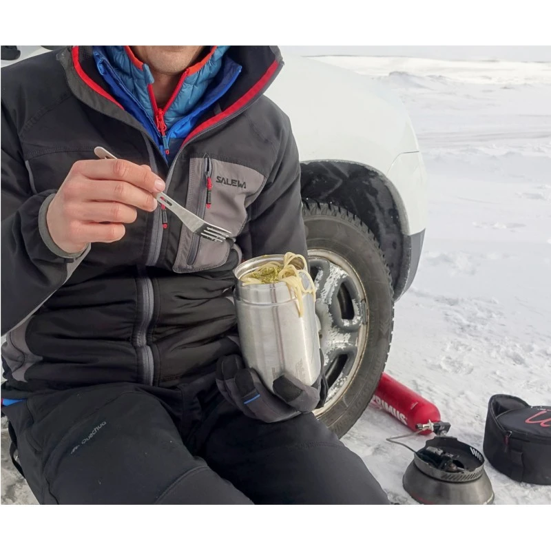 Einfach mal eine warme, selbstgekochte Suppe unterwegs schlürfen oder einen knackigen Salat mitten im Nirgendwo knabbern? Der Thermobecher machts möglich! Der doppelwandige Behälter hält Speisen bis zu 6h lang warm oder auch bis zu 12h lang knackig frisch und kühl. Er besitzt eine große Öffnung, welche das Befüllen mit Speisen sowie die Reinigung erheblich erleichtert.