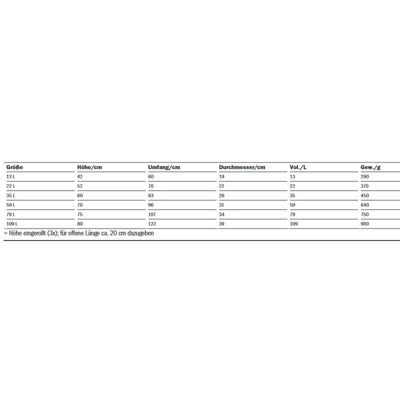 - IP64 – Hinweis: Packsäcke zur Erreichung des Schutzgrades mindestens 5-6 mal einrollen. Für die Höhe im unverschlossenen Zustand bitte 15-20 cm hinzurechnen