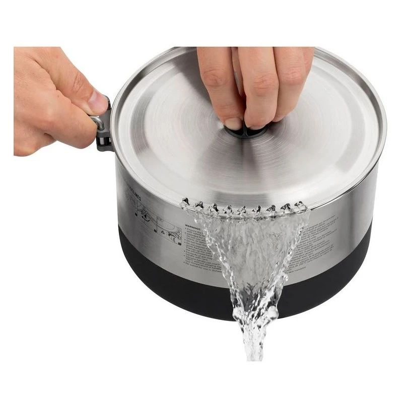 Das Set setzt sich zusammen aus einem leichten Trinkbecher, einer LightBowl sowie einem Topf. Der robuste Kochtopf aus Edelstahl gibt es in der 1,2 Liter Variante. Becher und Bowl bestehen aus BPA-freiem Polypropylen und sind zudem mikrowellensicher sowie ergonomisch geformt. Der Topf wurde mit einer thermischen Anti-Rutsch-Basisbeschichtung versehen, die für Stabilität auf dem Kocher sorgt. Außerdem ermöglicht der patentierte Pivot-Lock™ Griff ein angenehmes Handling beim Kochen. Wird der Griff eingeklappt, befestigt er automatisch den Topfdeckel auf dem Topf. Im Topfdeckel wurde außerdem ein leichtfließendes Sieb integriert für ein effizientes Abgießen.